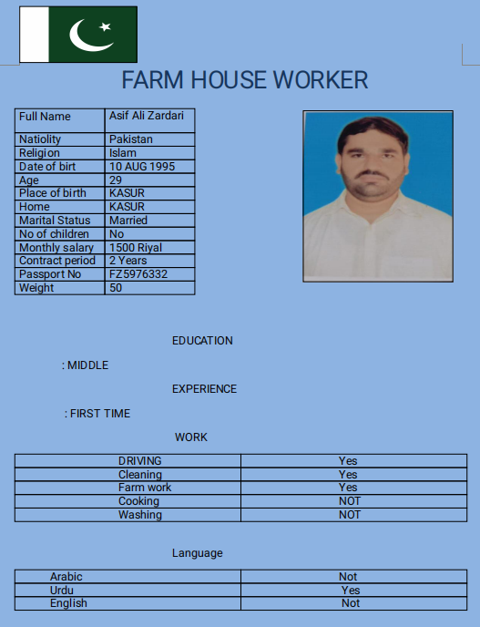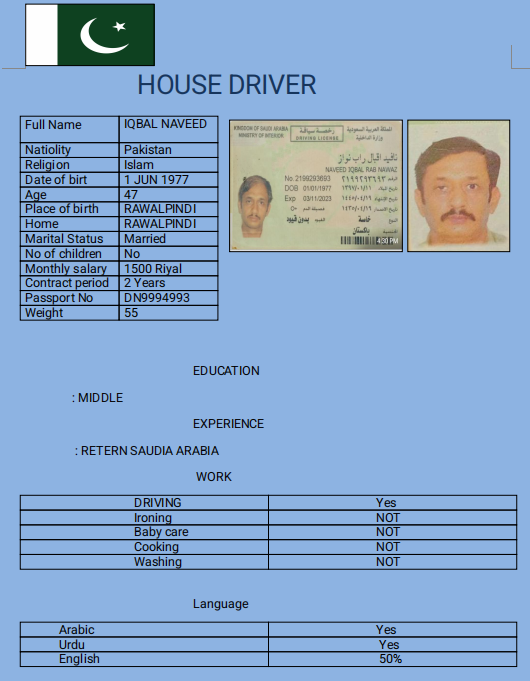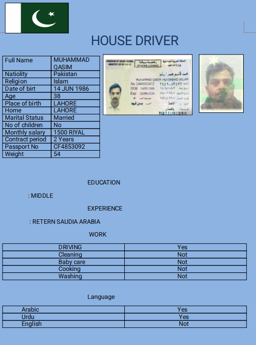 Service Type Service Type Recruitment Rent Transfer Services Nationality Nationality Philippines India Egypt Kenya Ethiopia Burundi Bangladesh Uganda Uganda MAROFFA Pakistan Philippines Indonesia Career Housemaid Family driver Care GIVER Couple (DRIVER AND DH ) Religion Muslim Non-Muslim Choose Experience Previous Work Never Worked Age Age 15 16 17 18 19 20 21 22 23 24 25 26 27 28 29 30 31 32 33 34 35 36 37 38 39 40 41 42 43 44 45 46 47 48 49 50 51 52 53 54 55 56 57 58 59 60 Family Status Family Status Single Married Divorced Widowed Language Language Arabic Arabic Arabic Bengali Nepalese Filipino Amharic Swahili Arabic + its primary language Indonesian Ugandan Burundi Weight Weight 40 41 42 43 44 45 46 47 48 49 50 51 52 53 54 55 56 57 58 59 60 61 62 63 64 65 66 67 68 69 70 71 72 73 74 75 76 77 78 79 80 81 82 83 84 85 86 87 88 89 90 91 92 93 94 95 96 97 98 99 100 Height Height 100 101 102 103 104 105 106 107 108 109 110 111 112 113 114 115 116 117 118 119 120 121 122 123 124 125 126 127 128 129 130 131 132 133 134 135 136 137 138 139 140 141 142 143 144 145 146 147 148 149 150 151 152 153 154 155 156 157 158 159 160 161 162 163 164 165 166 167 168 169 170 171 172 173 174 175 176 177 178 179 180 181 182 183 184 185 186 187 188 189 190 Orders Orders Cleaning Laundry Ironing Arab Cooking Child Care Child Appearance Care Infant Care Child Education Cleaning - Washing - Ironing Cleaning - Washing - Ironing - Desire to learn cooking Cleaning - Washing - Ironing - Desire to take care of children Search Clear Advanced Search MUHAMMAD QASIM باكستان Age 38 Experince Previous Work Relegion Muslim File Number CF4853092 Reserve the worker Asif Ali Zardari باكستان Age 29 Experince Never Worked Relegion Muslim File Number FZ5976332 Reserve the worker IQBAL NAVEED باكستان Age 47 Experince Previous Work Relegion Muslim File Number DN9994993 Reserve the worker