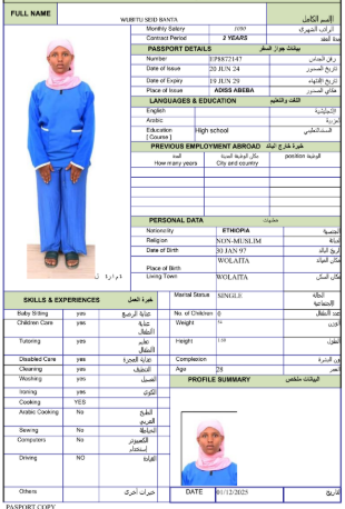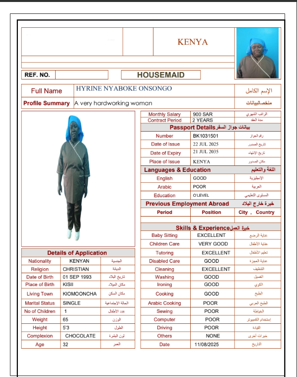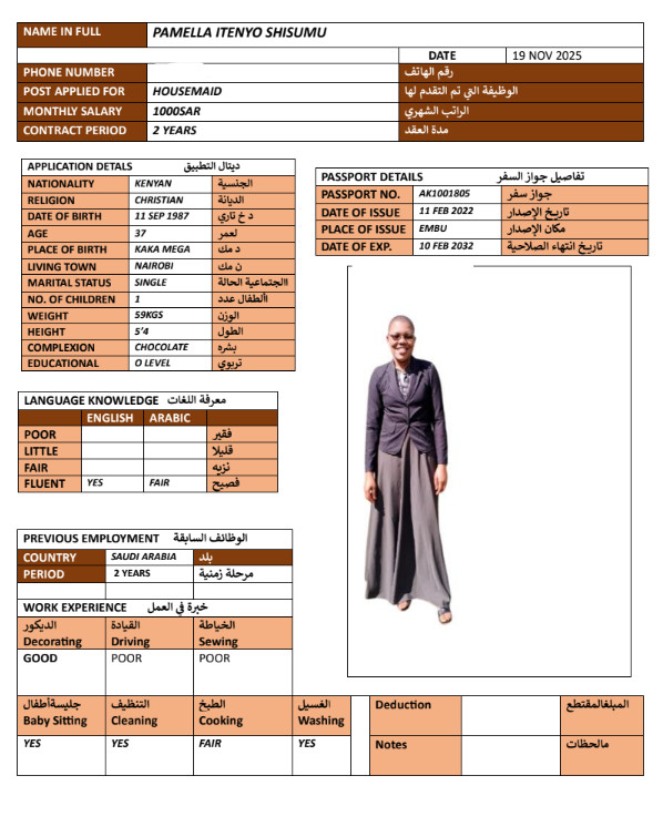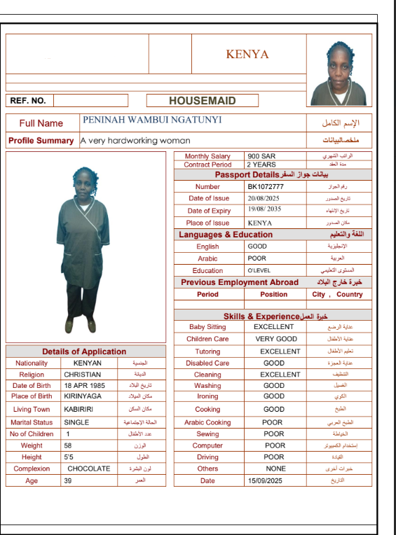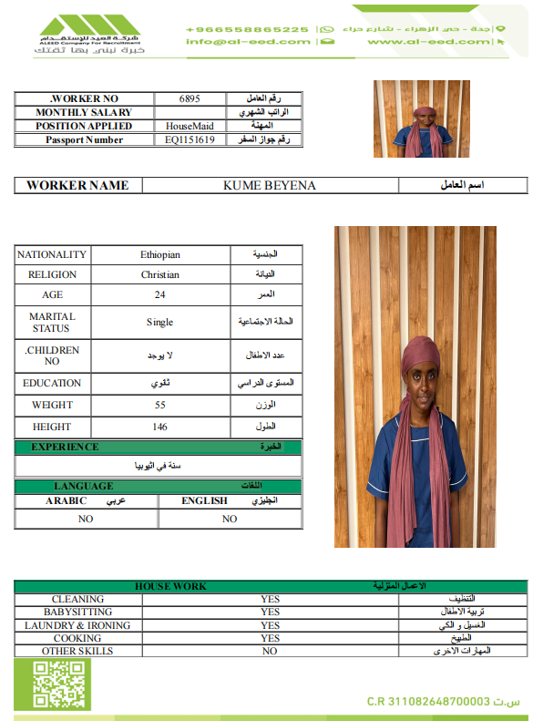 نوع الخدمة نوع الخدمة استقدام تأجير نقل خدمات الجنسية الجنسية الفلبين الهند مصر كينيا اثيوبيا بروندي بنغلاديش أوغندا أوغندا معروفة باكستان الفلبين معروفة اندونيسيا المهنة عاملة منزلية سائق خاص عاملة عناية زوجين ( عامله منزليه وسائق ) الديانة مسلم غير مسلم الخبرة سبق العمل لم يسبق العمل العمر العمر 15 16 17 18 19 20 21 22 23 24 25 26 27 28 29 30 31 32 33 34 35 36 37 38 39 40 41 42 43 44 45 46 47 48 49 50 51 52 53 54 55 56 57 58 59 60 الحالة العائلية الحالة العائلية اعزب متزوج مطلق ارمل اللغة اللغة العربية العربية العربية بنجالي نبالي فلبيني امهرية سواحلي عربي + لغتها الاساسية اندونيسي اوغندي بروندي الوزن الوزن 40 41 42 43 44 45 46 47 48 49 50 51 52 53 54 55 56 57 58 59 60 61 62 63 64 65 66 67 68 69 70 71 72 73 74 75 76 77 78 79 80 81 82 83 84 85 86 87 88 89 90 91 92 93 94 95 96 97 98 99 100 الطول الطول 100 101 102 103 104 105 106 107 108 109 110 111 112 113 114 115 116 117 118 119 120 121 122 123 124 125 126 127 128 129 130 131 132 133 134 135 136 137 138 139 140 141 142 143 144 145 146 147 148 149 150 151 152 153 154 155 156 157 158 159 160 161 162 163 164 165 166 167 168 169 170 171 172 173 174 175 176 177 178 179 180 181 182 183 184 185 186 187 188 189 190 الطلبات الطلبات التنظيف الغسيل الكوي الطبيخ العربي عناية الأطفال عناية كبار السن عناية الرضيع تعليم الأطفال التنظيف - الغسيل - الكوي التنظيف - الغسيل - الكوي- رغبة في تعلم الطبخ التنظيف - الغسيل - الكوي- رغبة في العناية بالاطفال بحث مسح بحث متقدم HYRINE NYABOKE ONSONGO كينيا العمر 32 الخبرة لم يسبق العمل الديانة غير مسلم رقم الملف BK1031501 حجز العاملة PAMELLA ITENYO SHISUMU كينيا العمر 37 الخبرة لم يسبق العمل الديانة غير مسلم رقم الملف AK1001805 حجز العاملة PENINAH WAMBUI NGATUNYI كينيا العمر 39 الخبرة لم يسبق العمل الديانة غير مسلم رقم الملف BK1072777 حجز العاملة ZAMZAMU HUSEN اثيوبيا العمر 25 الخبرة لم يسبق العمل الديانة مسلم رقم الملف EQ2070182 حجز العاملة KUME BEYENA اثيوبيا العمر 24 الخبرة لم يسبق العمل الديانة غير مسلم رقم الملف EQ1151619 حجز العاملة FATUMA TAFESA اثيوبيا العمر 25 الخبرة لم يسبق العمل الديانة مسلم رقم الملف EQ2779221 حجز العاملة BETELHEM HABTAMU اثيوبيا العمر 21 الخبرة لم يسبق العمل الديانة غير مسلم رقم الملف EQ1970114 حجز العاملة TESFA TEGEGNE اثيوبيا العمر 26 الخبرة لم يسبق العمل الديانة غير مسلم رقم الملف EQ1643217 حجز العاملة MESTWAT GETO اثيوبيا العمر 21 الخبرة لم يسبق العمل الديانة غير مسلم رقم الملف EQ2177396 حجز العاملة WUBITU SEID BANTA اثيوبيا العمر 28 الخبرة لم يسبق العمل الديانة غير مسلم رقم الملف EP8872147 حجز العاملة 1 2 3 4