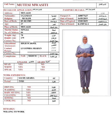 نوع الخدمة نوع الخدمة استقدام تأجير نقل خدمات الجنسية الجنسية الفلبين الهند مصر كينيا اثيوبيا بروندي بنغلاديش أوغندا أوغندا معروفة باكستان الفلبين معروفة اندونيسيا المهنة عاملة منزلية سائق خاص عاملة عناية زوجين ( عامله منزليه وسائق ) الديانة مسلم غير مسلم الخبرة سبق العمل لم يسبق العمل العمر العمر 15 16 17 18 19 20 21 22 23 24 25 26 27 28 29 30 31 32 33 34 35 36 37 38 39 40 41 42 43 44 45 46 47 48 49 50 51 52 53 54 55 56 57 58 59 60 الحالة العائلية الحالة العائلية اعزب متزوج مطلق ارمل اللغة اللغة العربية العربية العربية بنجالي نبالي فلبيني امهرية سواحلي عربي + لغتها الاساسية اندونيسي اوغندي بروندي الوزن الوزن 40 41 42 43 44 45 46 47 48 49 50 51 52 53 54 55 56 57 58 59 60 61 62 63 64 65 66 67 68 69 70 71 72 73 74 75 76 77 78 79 80 81 82 83 84 85 86 87 88 89 90 91 92 93 94 95 96 97 98 99 100 الطول الطول 100 101 102 103 104 105 106 107 108 109 110 111 112 113 114 115 116 117 118 119 120 121 122 123 124 125 126 127 128 129 130 131 132 133 134 135 136 137 138 139 140 141 142 143 144 145 146 147 148 149 150 151 152 153 154 155 156 157 158 159 160 161 162 163 164 165 166 167 168 169 170 171 172 173 174 175 176 177 178 179 180 181 182 183 184 185 186 187 188 189 190 الطلبات الطلبات التنظيف الغسيل الكوي الطبيخ العربي عناية الأطفال عناية كبار السن عناية الرضيع تعليم الأطفال التنظيف - الغسيل - الكوي التنظيف - الغسيل - الكوي- رغبة في تعلم الطبخ التنظيف - الغسيل - الكوي- رغبة في العناية بالاطفال بحث مسح بحث متقدم NAKKAZI MARCY أوغندا العمر 31 الخبرة لم يسبق العمل الديانة غير مسلم رقم الملف B00785957 حجز العاملة KAYEGI MARY أوغندا العمر 24 الخبرة لم يسبق العمل الديانة غير مسلم رقم الملف B00782573 حجز العاملة NAKAYIMA NASHIBA أوغندا العمر 22 الخبرة لم يسبق العمل الديانة مسلم رقم الملف B0081578 حجز العاملة NAKAYENGA MARIAM أوغندا العمر 35 الخبرة لم يسبق العمل الديانة مسلم رقم الملف B00658085 حجز العاملة NAHYAHA SCOVIA أوغندا العمر 28 الخبرة لم يسبق العمل الديانة غير مسلم رقم الملف A00807346 حجز العاملة CRYSTAL JOY MARTINEZ MENDOZA الفلبين العمر 38 الخبرة سبق العمل الديانة غير مسلم رقم الملف P3977345C حجز العاملة NABUKENYA SHAMIRAH أوغندا العمر 26 الخبرة لم يسبق العمل الديانة مسلم رقم الملف A00739704 حجز العاملة NABAGEGA MALIZA أوغندا العمر 31 الخبرة لم يسبق العمل الديانة غير مسلم رقم الملف B00602542 حجز العاملة NABACHWA CARLOLINE أوغندا العمر 36 الخبرة لم يسبق العمل الديانة غير مسلم رقم الملف A00570709 حجز العاملة MUTESI MWASITI أوغندا العمر 37 الخبرة لم يسبق العمل الديانة مسلم رقم الملف A00077637 حجز العاملة 1 2 3 4