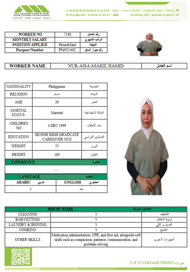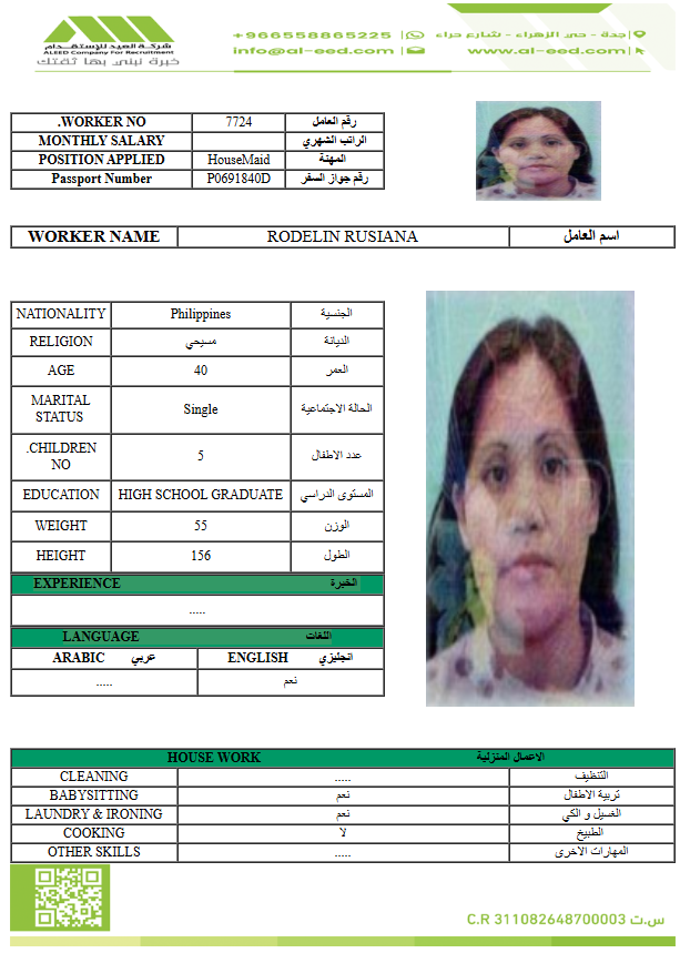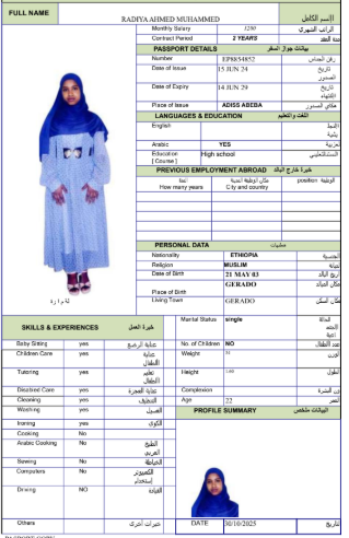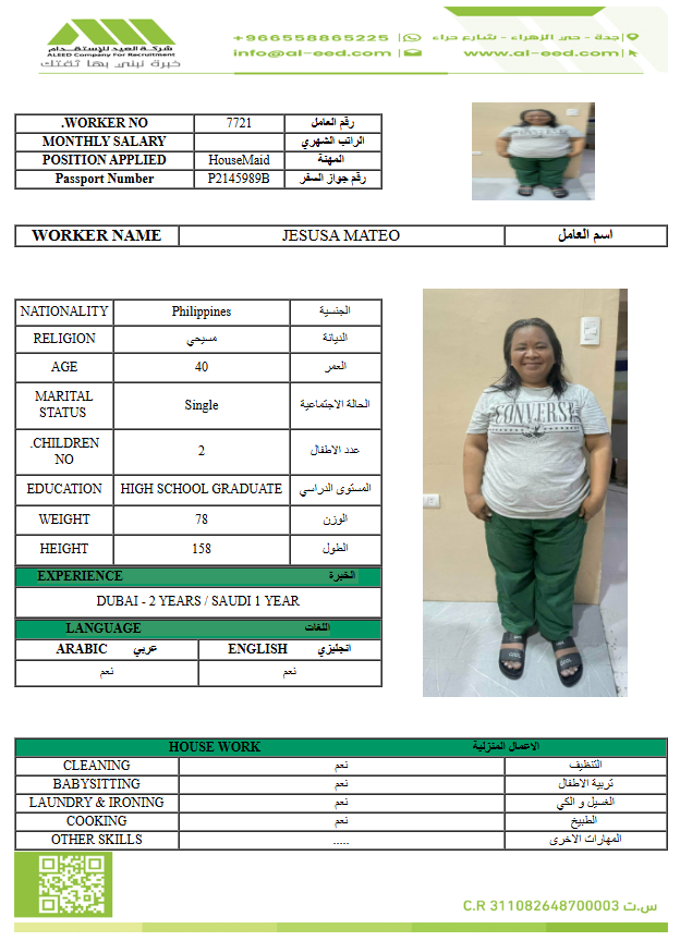 نوع الخدمة نوع الخدمة استقدام تأجير نقل خدمات الجنسية الجنسية الفلبين الهند مصر كينيا اثيوبيا بروندي بنغلاديش أوغندا أوغندا معروفة باكستان الفلبين معروفة اندونيسيا المهنة عاملة منزلية سائق خاص عاملة عناية زوجين ( عامله منزليه وسائق ) الديانة مسلم غير مسلم الخبرة سبق العمل لم يسبق العمل العمر العمر 15 16 17 18 19 20 21 22 23 24 25 26 27 28 29 30 31 32 33 34 35 36 37 38 39 40 41 42 43 44 45 46 47 48 49 50 51 52 53 54 55 56 57 58 59 60 الحالة العائلية الحالة العائلية اعزب متزوج مطلق ارمل اللغة اللغة العربية العربية العربية بنجالي نبالي فلبيني امهرية سواحلي عربي + لغتها الاساسية اندونيسي اوغندي بروندي الوزن الوزن 40 41 42 43 44 45 46 47 48 49 50 51 52 53 54 55 56 57 58 59 60 61 62 63 64 65 66 67 68 69 70 71 72 73 74 75 76 77 78 79 80 81 82 83 84 85 86 87 88 89 90 91 92 93 94 95 96 97 98 99 100 الطول الطول 100 101 102 103 104 105 106 107 108 109 110 111 112 113 114 115 116 117 118 119 120 121 122 123 124 125 126 127 128 129 130 131 132 133 134 135 136 137 138 139 140 141 142 143 144 145 146 147 148 149 150 151 152 153 154 155 156 157 158 159 160 161 162 163 164 165 166 167 168 169 170 171 172 173 174 175 176 177 178 179 180 181 182 183 184 185 186 187 188 189 190 الطلبات الطلبات التنظيف الغسيل الكوي الطبيخ العربي عناية الأطفال عناية كبار السن عناية الرضيع تعليم الأطفال التنظيف - الغسيل - الكوي التنظيف - الغسيل - الكوي- رغبة في تعلم الطبخ التنظيف - الغسيل - الكوي- رغبة في العناية بالاطفال بحث مسح بحث متقدم NUR-AISA ASAKIL HAMID الفلبين العمر 26 الخبرة لم يسبق العمل الديانة مسلم رقم الملف P8492140C حجز العاملة JESUSA MATEO الفلبين العمر 40 الخبرة سبق العمل الديانة غير مسلم رقم الملف P2145989B حجز العاملة ALI ZEHARAAHMED اثيوبيا العمر 25 الخبرة لم يسبق العمل الديانة مسلم رقم الملف EQ2572112 حجز العاملة SOFIYA ZEYINU OUMER اثيوبيا العمر 29 الخبرة لم يسبق العمل الديانة مسلم رقم الملف EQ2567339 حجز العاملة SITINA HUSSEN AHEMED اثيوبيا العمر 23 الخبرة لم يسبق العمل الديانة مسلم رقم الملف EQ2070275 حجز العاملة SEMIRA BIRHAN MEKASHI اثيوبيا العمر 24 الخبرة لم يسبق العمل الديانة مسلم رقم الملف EQ2034642 حجز العاملة REISA AHMED ESMAEL اثيوبيا العمر 30 الخبرة لم يسبق العمل الديانة مسلم رقم الملف EP6450467 حجز العاملة RADIYA HUSEN GURA اثيوبيا العمر 25 الخبرة لم يسبق العمل الديانة مسلم رقم الملف EQ2263304 حجز العاملة MUHAMMED RADIYAAHMED اثيوبيا العمر 22 الخبرة لم يسبق العمل الديانة مسلم رقم الملف EP8854852 حجز العاملة RODELIN RUSIANA الفلبين العمر 40 الخبرة لم يسبق العمل الديانة غير مسلم رقم الملف P0691840D حجز العاملة 8 9 10 11 12 13 14 15 16