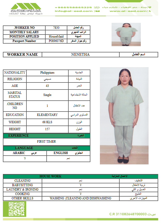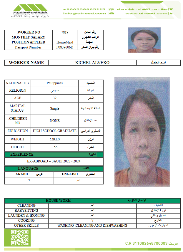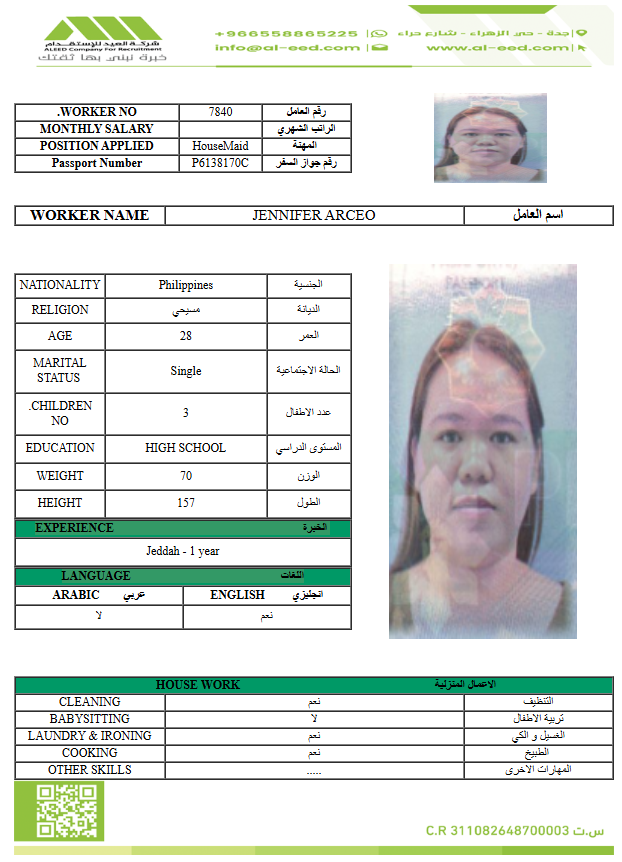 نوع الخدمة نوع الخدمة استقدام تأجير نقل خدمات الجنسية الجنسية الفلبين الهند مصر كينيا اثيوبيا بروندي بنغلاديش أوغندا أوغندا معروفة باكستان الفلبين معروفة اندونيسيا المهنة عاملة منزلية سائق خاص عاملة عناية زوجين ( عامله منزليه وسائق ) الديانة مسلم غير مسلم الخبرة سبق العمل لم يسبق العمل العمر العمر 15 16 17 18 19 20 21 22 23 24 25 26 27 28 29 30 31 32 33 34 35 36 37 38 39 40 41 42 43 44 45 46 47 48 49 50 51 52 53 54 55 56 57 58 59 60 الحالة العائلية الحالة العائلية اعزب متزوج مطلق ارمل اللغة اللغة العربية العربية العربية بنجالي نبالي فلبيني امهرية سواحلي عربي + لغتها الاساسية اندونيسي اوغندي بروندي الوزن الوزن 40 41 42 43 44 45 46 47 48 49 50 51 52 53 54 55 56 57 58 59 60 61 62 63 64 65 66 67 68 69 70 71 72 73 74 75 76 77 78 79 80 81 82 83 84 85 86 87 88 89 90 91 92 93 94 95 96 97 98 99 100 الطول الطول 100 101 102 103 104 105 106 107 108 109 110 111 112 113 114 115 116 117 118 119 120 121 122 123 124 125 126 127 128 129 130 131 132 133 134 135 136 137 138 139 140 141 142 143 144 145 146 147 148 149 150 151 152 153 154 155 156 157 158 159 160 161 162 163 164 165 166 167 168 169 170 171 172 173 174 175 176 177 178 179 180 181 182 183 184 185 186 187 188 189 190 الطلبات الطلبات التنظيف الغسيل الكوي الطبيخ العربي عناية الأطفال عناية كبار السن عناية الرضيع تعليم الأطفال التنظيف - الغسيل - الكوي التنظيف - الغسيل - الكوي- رغبة في تعلم الطبخ التنظيف - الغسيل - الكوي- رغبة في العناية بالاطفال بحث مسح بحث متقدم KEMSO HAJI GELCHU اثيوبيا العمر 26 الخبرة لم يسبق العمل الديانة مسلم رقم الملف EQ2605004 حجز العاملة GOBENE WAKEYO JARSO اثيوبيا العمر 25 الخبرة لم يسبق العمل الديانة مسلم رقم الملف EQ2330933 حجز العاملة BETELHEM DAWIT MOJA اثيوبيا العمر 23 الخبرة لم يسبق العمل الديانة غير مسلم رقم الملف EQ1261745 حجز العاملة AYANTU SINBIRU NAMU اثيوبيا العمر 26 الخبرة لم يسبق العمل الديانة غير مسلم رقم الملف EQ1763623 حجز العاملة JEANETTE MENDEZ الفلبين العمر 44 الخبرة لم يسبق العمل الديانة غير مسلم رقم الملف P0933145D حجز العاملة JENNIFER ARCEO الفلبين العمر 28 الخبرة سبق العمل الديانة غير مسلم رقم الملف P6138170C حجز العاملة NENETHA الفلبين العمر 43 الخبرة لم يسبق العمل الديانة غير مسلم رقم الملف P0896076D حجز العاملة LEONILA NALUPANO الفلبين العمر 40 الخبرة لم يسبق العمل الديانة غير مسلم رقم الملف P0871396D حجز العاملة RICHEL ALVERO الفلبين العمر 32 الخبرة سبق العمل الديانة غير مسلم رقم الملف P0839606D حجز العاملة BEKELU TOLA اثيوبيا العمر 21 الخبرة لم يسبق العمل الديانة غير مسلم رقم الملف EQ1057136 حجز العاملة 1 2 3 4 5 6