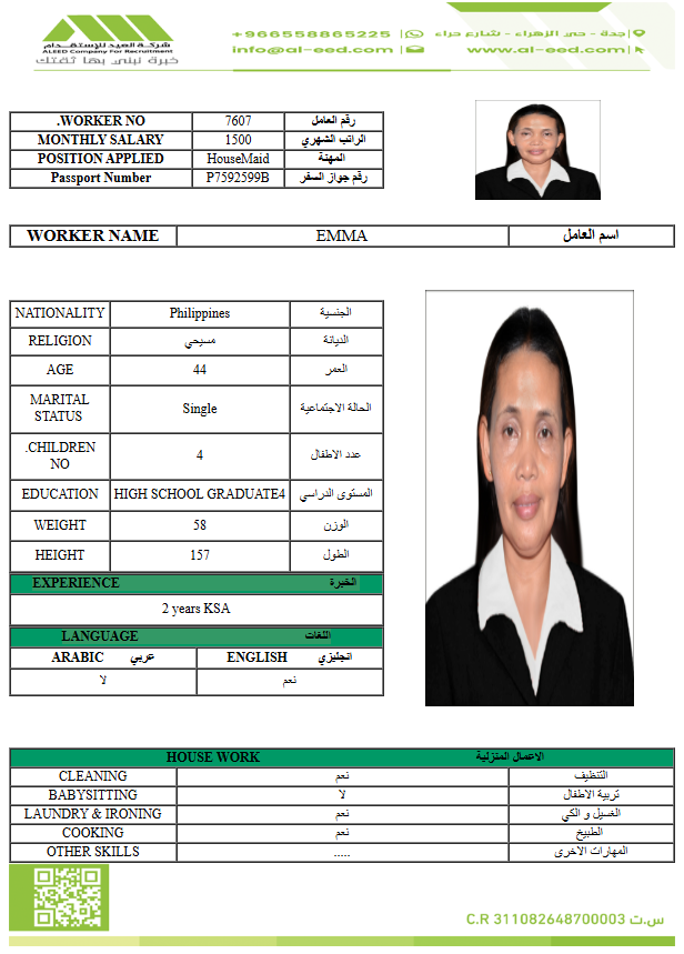 نوع الخدمة نوع الخدمة استقدام تأجير نقل خدمات الجنسية الجنسية الفلبين الهند مصر كينيا اثيوبيا بروندي بنغلاديش أوغندا أوغندا معروفة باكستان الفلبين معروفة اندونيسيا المهنة عاملة منزلية سائق خاص عاملة عناية زوجين ( عامله منزليه وسائق ) الديانة مسلم غير مسلم الخبرة سبق العمل لم يسبق العمل العمر العمر 15 16 17 18 19 20 21 22 23 24 25 26 27 28 29 30 31 32 33 34 35 36 37 38 39 40 41 42 43 44 45 46 47 48 49 50 51 52 53 54 55 56 57 58 59 60 الحالة العائلية الحالة العائلية اعزب متزوج مطلق ارمل اللغة اللغة العربية العربية العربية بنجالي نبالي فلبيني امهرية سواحلي عربي + لغتها الاساسية اندونيسي اوغندي بروندي الوزن الوزن 40 41 42 43 44 45 46 47 48 49 50 51 52 53 54 55 56 57 58 59 60 61 62 63 64 65 66 67 68 69 70 71 72 73 74 75 76 77 78 79 80 81 82 83 84 85 86 87 88 89 90 91 92 93 94 95 96 97 98 99 100 الطول الطول 100 101 102 103 104 105 106 107 108 109 110 111 112 113 114 115 116 117 118 119 120 121 122 123 124 125 126 127 128 129 130 131 132 133 134 135 136 137 138 139 140 141 142 143 144 145 146 147 148 149 150 151 152 153 154 155 156 157 158 159 160 161 162 163 164 165 166 167 168 169 170 171 172 173 174 175 176 177 178 179 180 181 182 183 184 185 186 187 188 189 190 الطلبات الطلبات التنظيف الغسيل الكوي الطبيخ العربي عناية الأطفال عناية كبار السن عناية الرضيع تعليم الأطفال التنظيف - الغسيل - الكوي التنظيف - الغسيل - الكوي- رغبة في تعلم الطبخ التنظيف - الغسيل - الكوي- رغبة في العناية بالاطفال بحث مسح بحث متقدم EMMA الفلبين العمر 44 الخبرة سبق العمل الديانة غير مسلم رقم الملف P7592599B حجز العاملة TAMIRE AHMED ABEBAW اثيوبيا العمر 27 الخبرة لم يسبق العمل الديانة مسلم رقم الملف EQ2824924 حجز العاملة TADELECH WOLEBO WOTICHO اثيوبيا العمر 27 الخبرة لم يسبق العمل الديانة غير مسلم رقم الملف EP8724452 حجز العاملة ➜SINTAYEHU SHUMYE ARAGE اثيوبيا العمر 33 الخبرة لم يسبق العمل الديانة مسلم رقم الملف EP8566112 حجز العاملة SENEDU ABEBE MOLLA اثيوبيا العمر 25 الخبرة لم يسبق العمل الديانة غير مسلم رقم الملف EQ8927968 حجز العاملة SELAMAWIT BAYE MELESE اثيوبيا العمر 23 الخبرة لم يسبق العمل الديانة غير مسلم رقم الملف EQ2757667 حجز العاملة SEADA MOHAMMED SEID اثيوبيا العمر 25 الخبرة لم يسبق العمل الديانة مسلم رقم الملف EQ1374411 حجز العاملة SEADA HUSEN ENDRIS اثيوبيا العمر 25 الخبرة لم يسبق العمل الديانة مسلم رقم الملف EQ2062442 حجز العاملة SEADA FENTAW HASSEN اثيوبيا العمر 23 الخبرة لم يسبق العمل الديانة مسلم رقم الملف EQ1742270 حجز العاملة SEADA ENDRIS YIMAM اثيوبيا العمر 25 الخبرة لم يسبق العمل الديانة مسلم رقم الملف EQ1544106 حجز العاملة 23 24 25 26 27 28 29 30 31