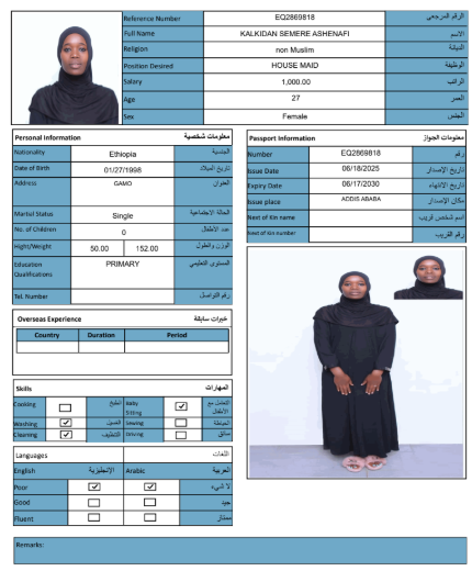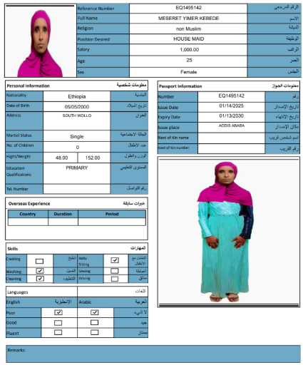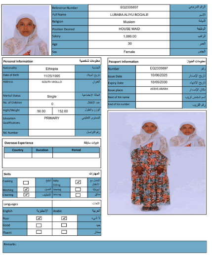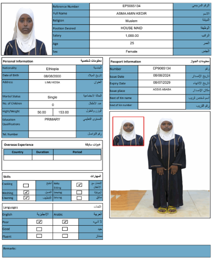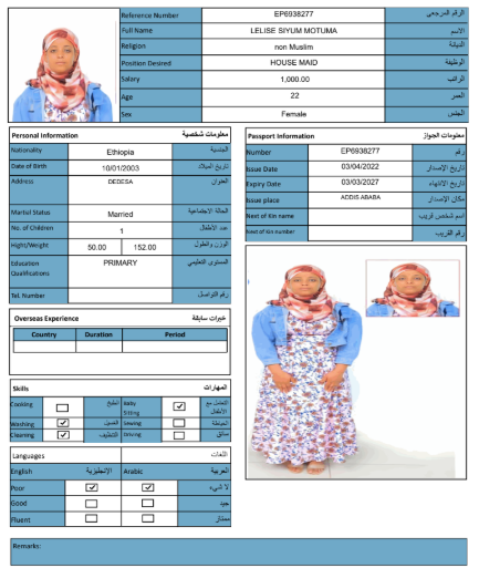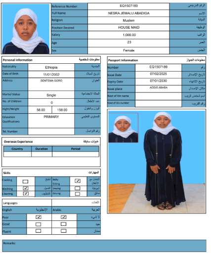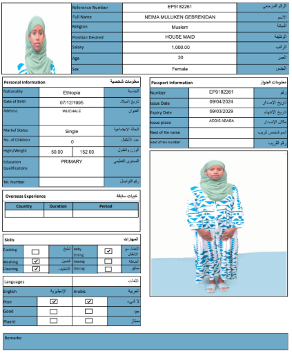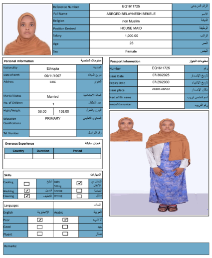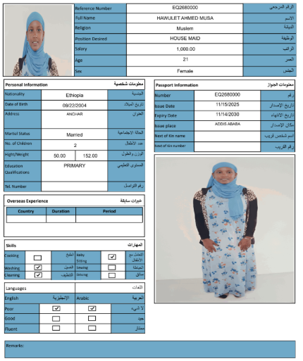 نوع الخدمة نوع الخدمة استقدام تأجير نقل خدمات الجنسية الجنسية الفلبين الهند مصر كينيا اثيوبيا بروندي بنغلاديش أوغندا أوغندا معروفة باكستان الفلبين معروفة اندونيسيا المهنة عاملة منزلية سائق خاص عاملة عناية زوجين ( عامله منزليه وسائق ) الديانة مسلم غير مسلم الخبرة سبق العمل لم يسبق العمل العمر العمر 15 16 17 18 19 20 21 22 23 24 25 26 27 28 29 30 31 32 33 34 35 36 37 38 39 40 41 42 43 44 45 46 47 48 49 50 51 52 53 54 55 56 57 58 59 60 الحالة العائلية الحالة العائلية اعزب متزوج مطلق ارمل اللغة اللغة العربية العربية العربية بنجالي نبالي فلبيني امهرية سواحلي عربي + لغتها الاساسية اندونيسي اوغندي بروندي الوزن الوزن 40 41 42 43 44 45 46 47 48 49 50 51 52 53 54 55 56 57 58 59 60 61 62 63 64 65 66 67 68 69 70 71 72 73 74 75 76 77 78 79 80 81 82 83 84 85 86 87 88 89 90 91 92 93 94 95 96 97 98 99 100 الطول الطول 100 101 102 103 104 105 106 107 108 109 110 111 112 113 114 115 116 117 118 119 120 121 122 123 124 125 126 127 128 129 130 131 132 133 134 135 136 137 138 139 140 141 142 143 144 145 146 147 148 149 150 151 152 153 154 155 156 157 158 159 160 161 162 163 164 165 166 167 168 169 170 171 172 173 174 175 176 177 178 179 180 181 182 183 184 185 186 187 188 189 190 الطلبات الطلبات التنظيف الغسيل الكوي الطبيخ العربي عناية الأطفال عناية كبار السن عناية الرضيع تعليم الأطفال التنظيف - الغسيل - الكوي التنظيف - الغسيل - الكوي- رغبة في تعلم الطبخ التنظيف - الغسيل - الكوي- رغبة في العناية بالاطفال بحث مسح بحث متقدم NESRA JEMALU ABADIGA اثيوبيا العمر 23 الخبرة لم يسبق العمل الديانة مسلم رقم الملف EQ1507189 حجز العاملة NEIMA MULUKEN GEBREKIDAN اثيوبيا العمر 30 الخبرة لم يسبق العمل الديانة مسلم رقم الملف EP9182261 حجز العاملة MESERET YIMER KEBEDE اثيوبيا العمر 25 الخبرة لم يسبق العمل الديانة غير مسلم رقم الملف EQ1495142 حجز العاملة LUBABA ALIYU BOGALE اثيوبيا العمر 30 الخبرة لم يسبق العمل الديانة مسلم رقم الملف EQ2335697 حجز العاملة LELISE SIYUM MOTUMA اثيوبيا العمر 22 الخبرة لم يسبق العمل الديانة غير مسلم رقم الملف EP6938277 حجز العاملة KALKIDAN SEMERE ASHENAFI اثيوبيا العمر 27 الخبرة لم يسبق العمل الديانة غير مسلم رقم الملف EQ2869818 حجز العاملة HAWULET AHMED MUSA اثيوبيا العمر 21 الخبرة لم يسبق العمل الديانة مسلم رقم الملف EQ2680000 حجز العاملة ASEGED BELAYNESH BEKELE اثيوبيا العمر 28 الخبرة لم يسبق العمل الديانة غير مسلم رقم الملف EQ1611725 حجز العاملة ALIYA ADEM ABAS اثيوبيا العمر 24 الخبرة لم يسبق العمل الديانة مسلم رقم الملف EQ2793895 حجز العاملة ASMA AMIN KEDIR اثيوبيا العمر 25 الخبرة سبق العمل الديانة مسلم رقم الملف EP9065134 حجز العاملة 1 2 3 4 5 6 7 8 9