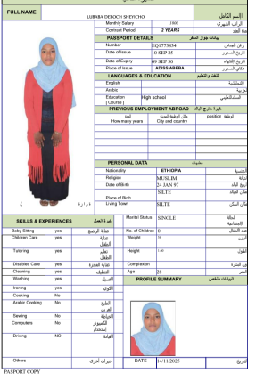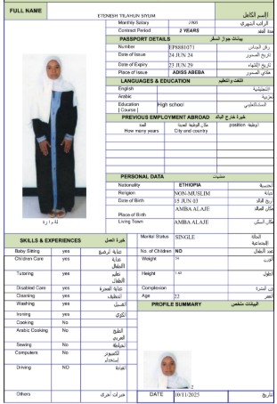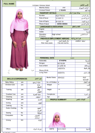 نوع الخدمة نوع الخدمة استقدام تأجير نقل خدمات الجنسية الجنسية الفلبين الهند مصر كينيا اثيوبيا بروندي بنغلاديش أوغندا أوغندا معروفة باكستان الفلبين معروفة اندونيسيا المهنة عاملة منزلية سائق خاص عاملة عناية زوجين ( عامله منزليه وسائق ) الديانة مسلم غير مسلم الخبرة سبق العمل لم يسبق العمل العمر العمر 15 16 17 18 19 20 21 22 23 24 25 26 27 28 29 30 31 32 33 34 35 36 37 38 39 40 41 42 43 44 45 46 47 48 49 50 51 52 53 54 55 56 57 58 59 60 الحالة العائلية الحالة العائلية اعزب متزوج مطلق ارمل اللغة اللغة العربية العربية العربية بنجالي نبالي فلبيني امهرية سواحلي عربي + لغتها الاساسية اندونيسي اوغندي بروندي الوزن الوزن 40 41 42 43 44 45 46 47 48 49 50 51 52 53 54 55 56 57 58 59 60 61 62 63 64 65 66 67 68 69 70 71 72 73 74 75 76 77 78 79 80 81 82 83 84 85 86 87 88 89 90 91 92 93 94 95 96 97 98 99 100 الطول الطول 100 101 102 103 104 105 106 107 108 109 110 111 112 113 114 115 116 117 118 119 120 121 122 123 124 125 126 127 128 129 130 131 132 133 134 135 136 137 138 139 140 141 142 143 144 145 146 147 148 149 150 151 152 153 154 155 156 157 158 159 160 161 162 163 164 165 166 167 168 169 170 171 172 173 174 175 176 177 178 179 180 181 182 183 184 185 186 187 188 189 190 الطلبات الطلبات التنظيف الغسيل الكوي الطبيخ العربي عناية الأطفال عناية كبار السن عناية الرضيع تعليم الأطفال التنظيف - الغسيل - الكوي التنظيف - الغسيل - الكوي- رغبة في تعلم الطبخ التنظيف - الغسيل - الكوي- رغبة في العناية بالاطفال بحث مسح بحث متقدم LUBABA TESFAYE ZENEBE اثيوبيا العمر 30 الخبرة لم يسبق العمل الديانة مسلم رقم الملف EQ2403128 حجز العاملة LUBABA DEBOCH SHEYICHO اثيوبيا العمر 28 الخبرة لم يسبق العمل الديانة مسلم رقم الملف EQ1773834 حجز العاملة KUBRA WORKU KASAW اثيوبيا العمر 26 الخبرة لم يسبق العمل الديانة مسلم رقم الملف EQ2331009 حجز العاملة KIBNESH DEBRE WEGELE اثيوبيا العمر 36 الخبرة لم يسبق العمل الديانة غير مسلم رقم الملف EP8995761 حجز العاملة JEMILA YASIN YESUF اثيوبيا العمر 22 الخبرة لم يسبق العمل الديانة مسلم رقم الملف EQ2862770 حجز العاملة HAYAT ESHETU AMEDE اثيوبيا العمر 24 الخبرة لم يسبق العمل الديانة مسلم رقم الملف EQ1667989 حجز العاملة HAWA SEID IBRAHIM اثيوبيا العمر 28 الخبرة لم يسبق العمل الديانة مسلم رقم الملف EQ2039396 حجز العاملة HAWA ABE KERSHI اثيوبيا العمر 35 الخبرة لم يسبق العمل الديانة مسلم رقم الملف EQ2249305 حجز العاملة FATUMA TEMAM YESUF اثيوبيا العمر 27 الخبرة لم يسبق العمل الديانة مسلم رقم الملف EQ1770334 حجز العاملة ETENESH TILAHUN SIYUM اثيوبيا العمر 22 الخبرة لم يسبق العمل الديانة غير مسلم رقم الملف EP8881071 حجز العاملة 4 5 6 7 8 9 10 11 12
